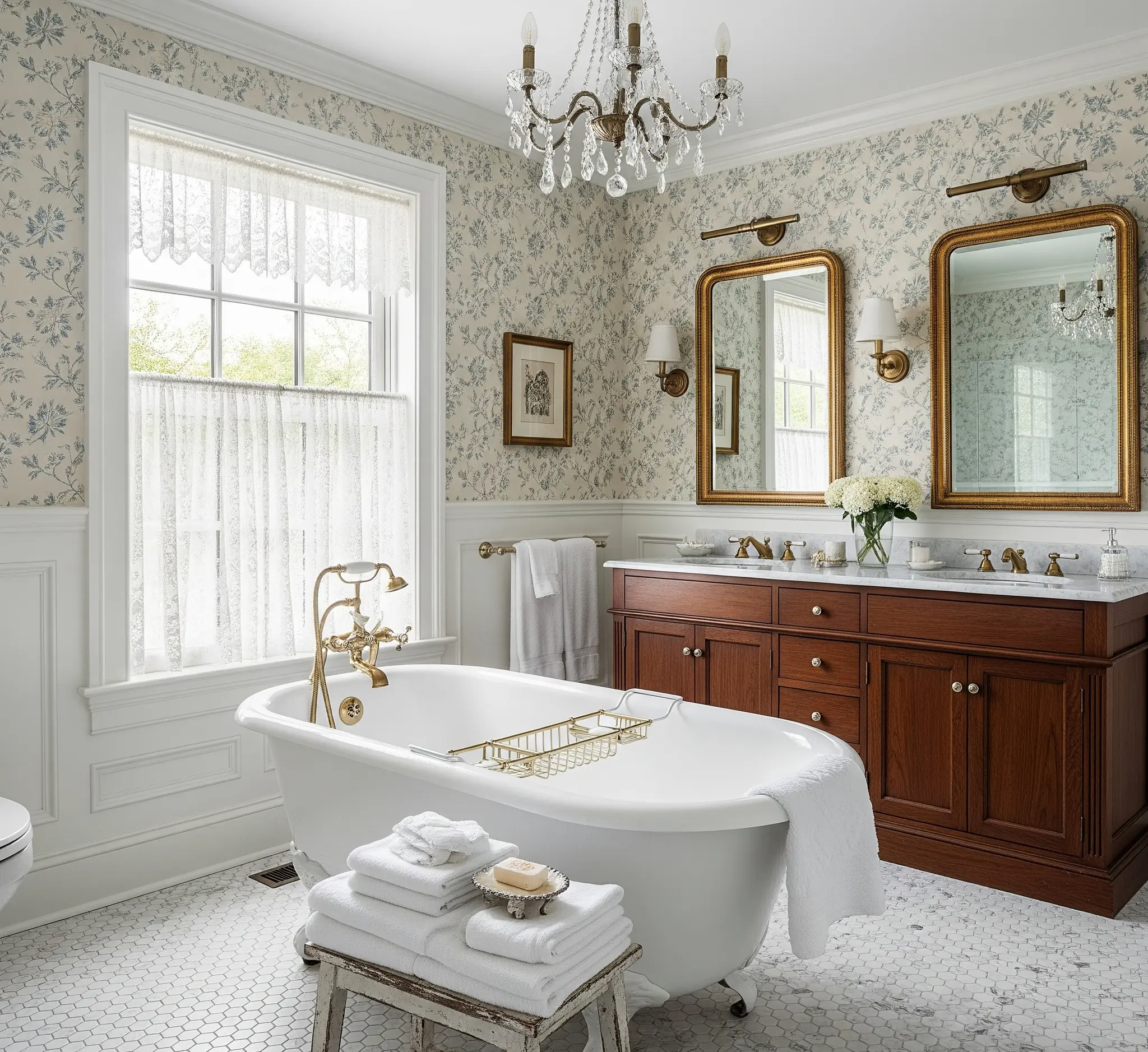 Classic elegance with timeless design elements, warm colors, and refined traditional fixtures.