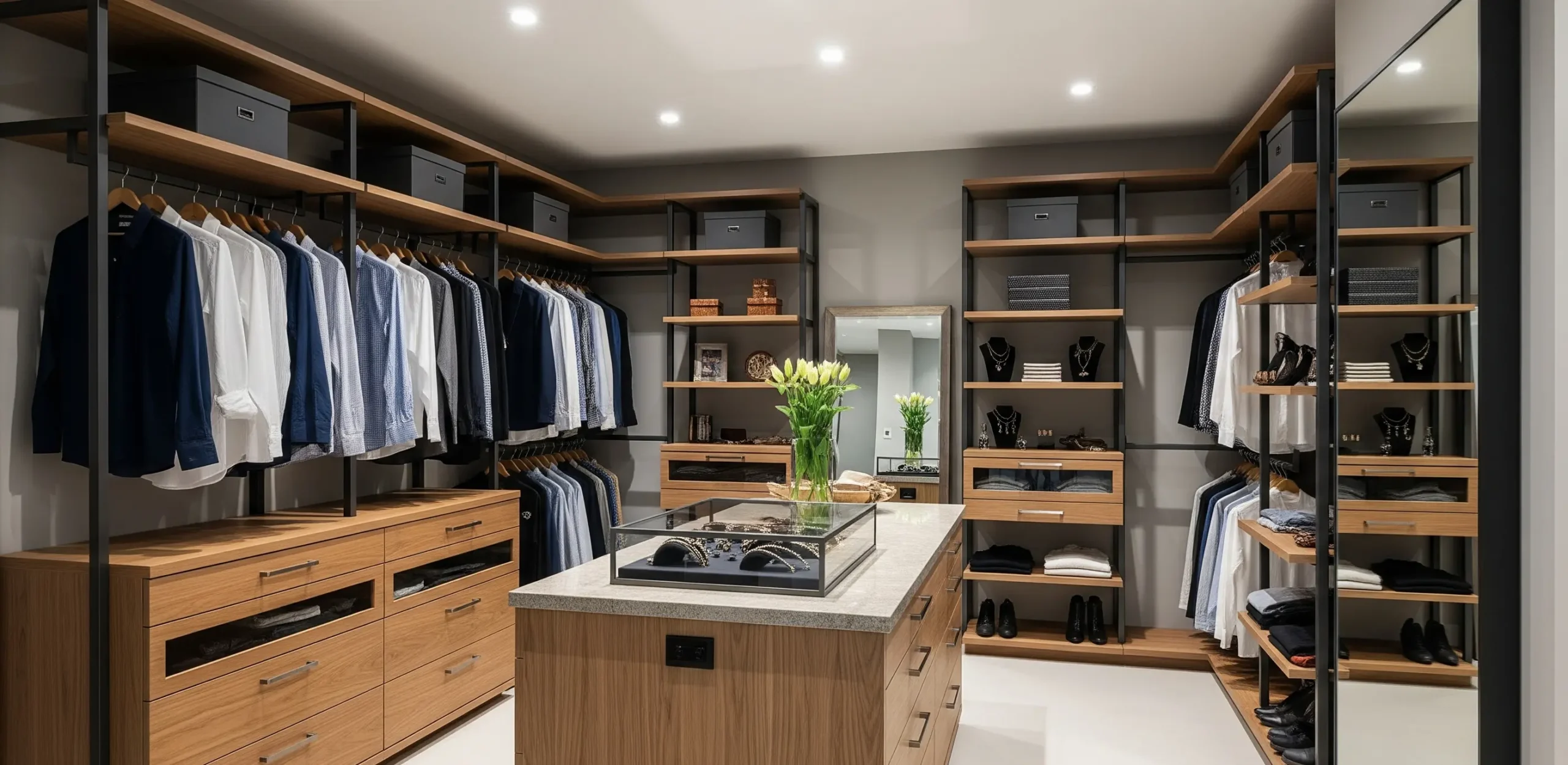 Make your closet work for your evolving wardrobe. Our adjustable shelving and rods are the foundation of a truly custom closet. They are a seamless storage solution designed to give you the flexibility to reconfigure your space as your needs change. We create custom shelving systems that can be easily moved, providing the perfect fit for everything from long dresses to folded sweaters, and ensuring no space is ever wasted.